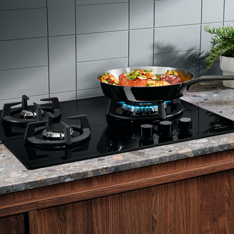 Placa de gas Electrolux KGE6633NOK de 60 cm con superficie Gas on Glass en cristal negro y tres zonas de cocción incluyendo quemador Wok y tecnología SpeedBurner. Mandos frontales con encendido electrónico y termopar de seguridad. Diseño fácil de limpiar, alto rendimiento y eficiencia en el uso diario.