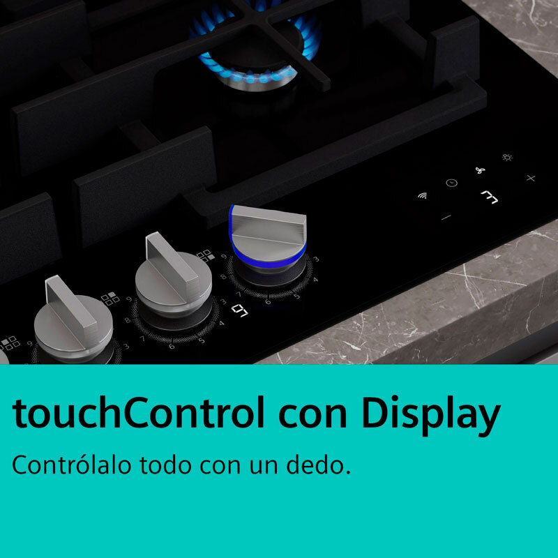 Placa de gas Siemens ER9A6SH40 de 90 cm con superficie de vidrio templado negro que combina diseño y funcionalidad. Incorpora 5 zonas de cocción con quemador Wok de alta potencia, tecnología stepFlame de 9 niveles, seguridad GasStop, mandos metálicos extraíbles e integración Home Connect para control y diagnóstico remoto.