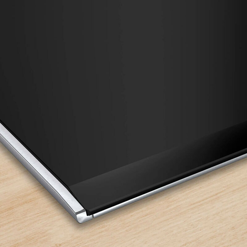 Placa de inducción Bosch PIE875HC1E de 80 cm con perfil profesional y superficie de cristal negro. Dispone de 4 zonas de cocción, zona extragrande de 28,0 cm, 17 niveles de potencia, PerfectFry para control preciso de la temperatura del aceite y conectividad Home Connect para control y actualizaciones remotas