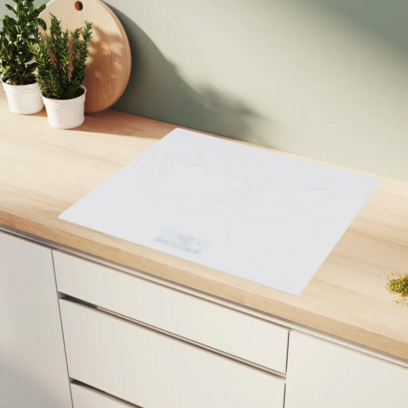 Placa de inducción integrable de 60 cm con superficie de vidrio vitrocerámico en color blanco. Ofrece tres zonas de cocción (incluida una zona triple de 32 cm), control táctil TouchSelect con 17 niveles, función Sprint (boost), temporizador por zona y múltiples sistemas de seguridad para uso doméstico eficiente y preciso.