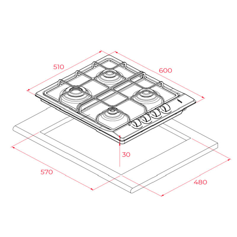 Placa de gas Teka E/60.3 40 de 60,0 cm en acabado acero inoxidable con cuatro quemadores (1 auxiliar, 2 semi-rápidos y 1 rápido) y potencia total de 7,5 kW. Incorpora mandos laterales ergonómicos, parrillas esmaltadas y seguridad por termopar en cada quemador para un uso seguro y fiable. Dimensiones de encastre 570 x 480 mm, altura 3,0 cm, diseño integrable y fácil mantenimiento.