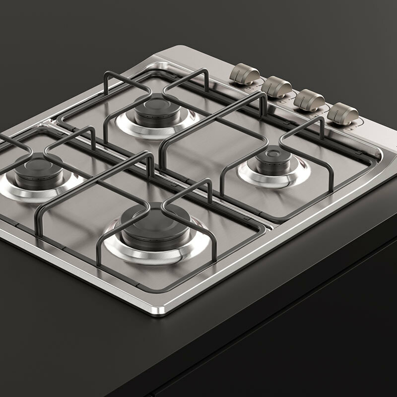 Placa de gas Teka E/60.3 40 en acero inoxidable integrable de 60 cm con cuatro quemadores que incluyen rápido de 3,0 kW, dos semirrápidos de 1,75 kW y auxiliar de 1,0 kW. Presenta mandos laterales ergonómicos, parrillas esmaltadas y seguridad por termopar en cada quemador para un uso doméstico potente y seguro.