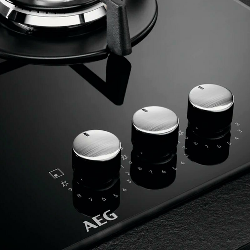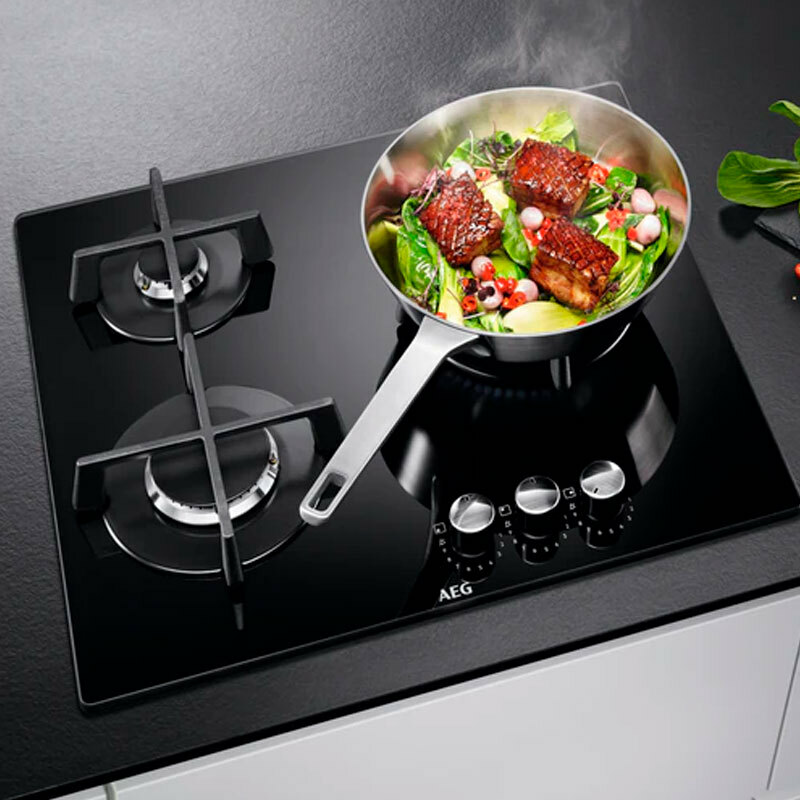 Placa de gas AEG HKB63320NB de 60 cm con superficie Gas on Glass en cristal negro diseñada para ofrecer rápida respuesta y gran precisión en la cocina. Dispone de 3 quemadores SpeedBurner incluido un quemador Wok, control mediante mandos giratorios frontales, sistema StepPower de 9 niveles y termopar de seguridad para corte de gas en caso de apagado accidental.