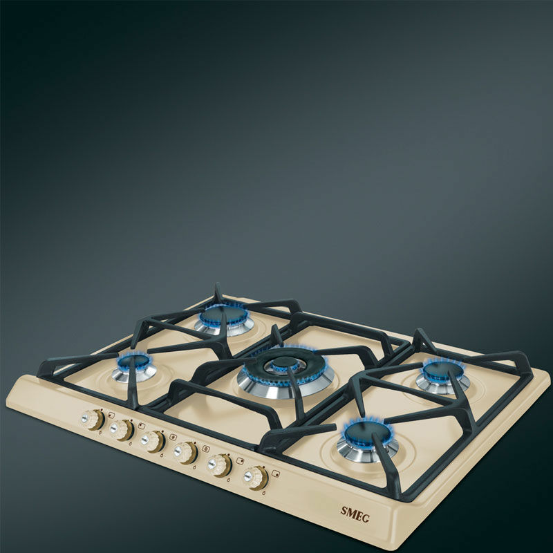 Placa de gas Smeg SR775PO de 70 cm con estética Cortina en color crema. Cuenta con cinco quemadores de alto rendimiento, parrillas de hierro fundido y sistema de válvulas de seguridad. Incorpora mandos frontales de precisión y acabado esmaltado fácil de limpiar. Diseño clásico, seguro y de larga vida.
