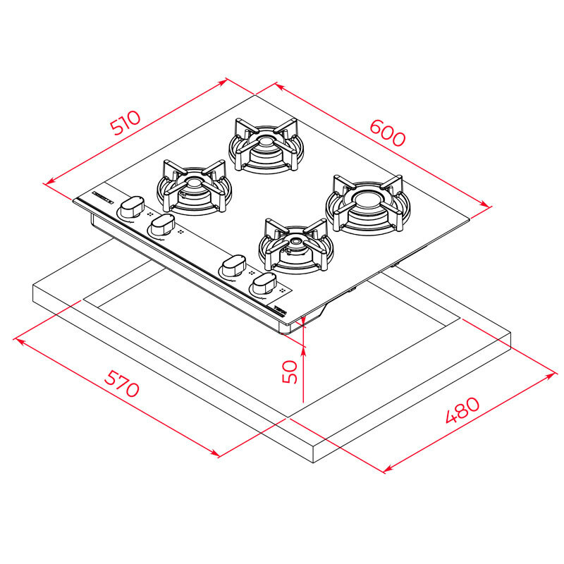 Placa de gas Teka GBC64G1BM – 60 cm, Cristal negro mate, 4 quemadores
