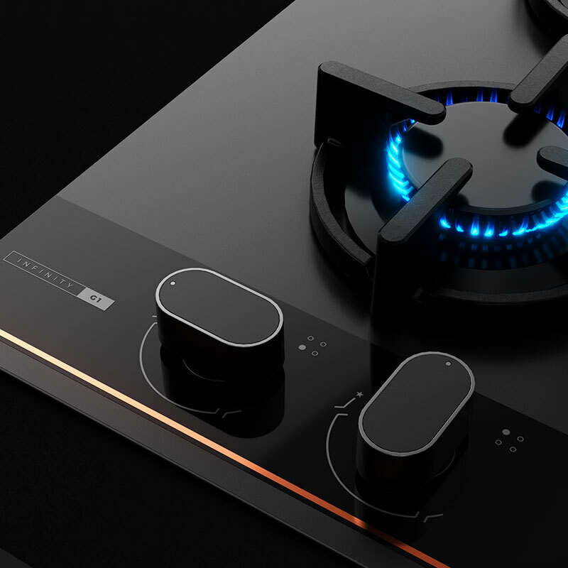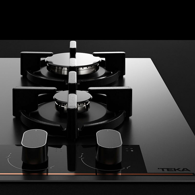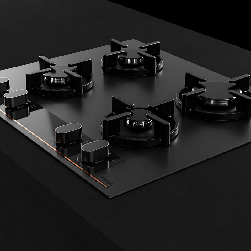 Placa de gas Teka GBC 64-G1 BM de 60 cm con superficie de cristal negro mate diseñada por Italdesign Giugiaro, cuatro quemadores de alta eficiencia, encendido automático y desconexión de seguridad, rejillas de hierro fundido y potencia total de 6.950 W para cocinado preciso y robusto. Acabado moderno y.