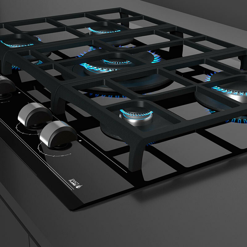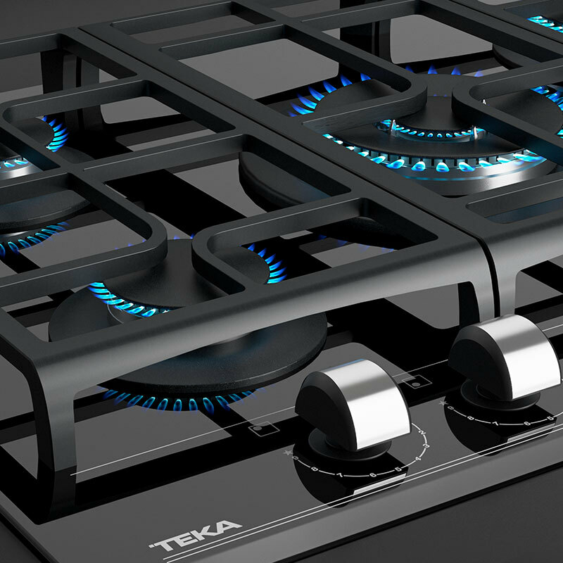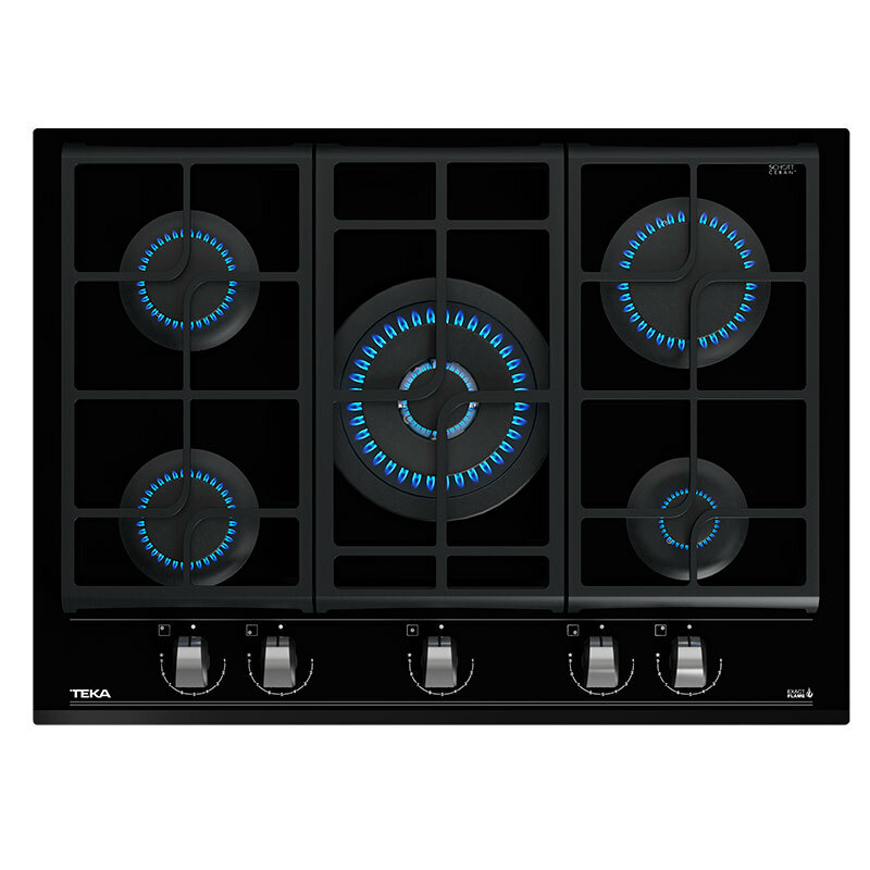 Placa de gas Teka de 70 cm con superficie de vidrio cerámico y bisel frontal que integra la tecnología ExactFlame para un control preciso de la llama. Dispone de 5 quemadores de alta eficiencia SABAF, encendido automático, bloqueo Auto Lock y rejillas de hierro fundido para un uso seguro y versátil.