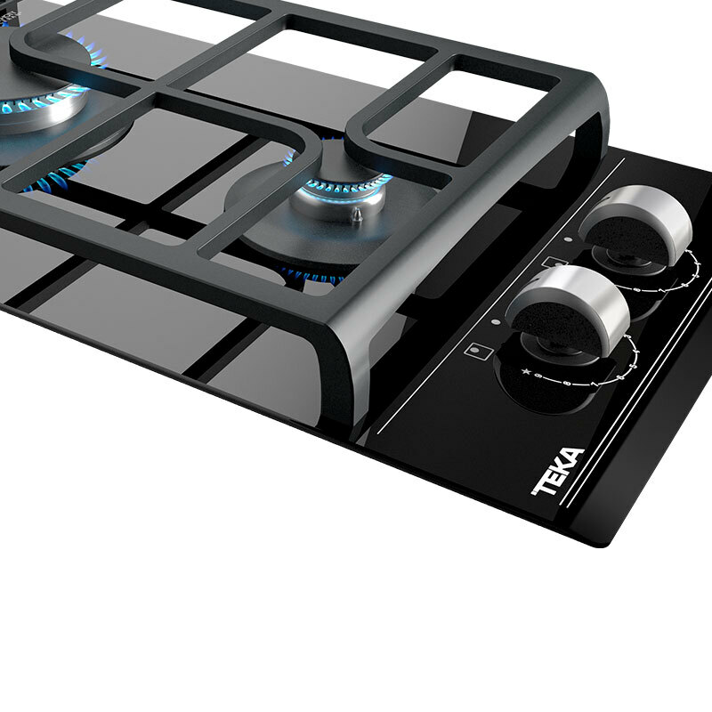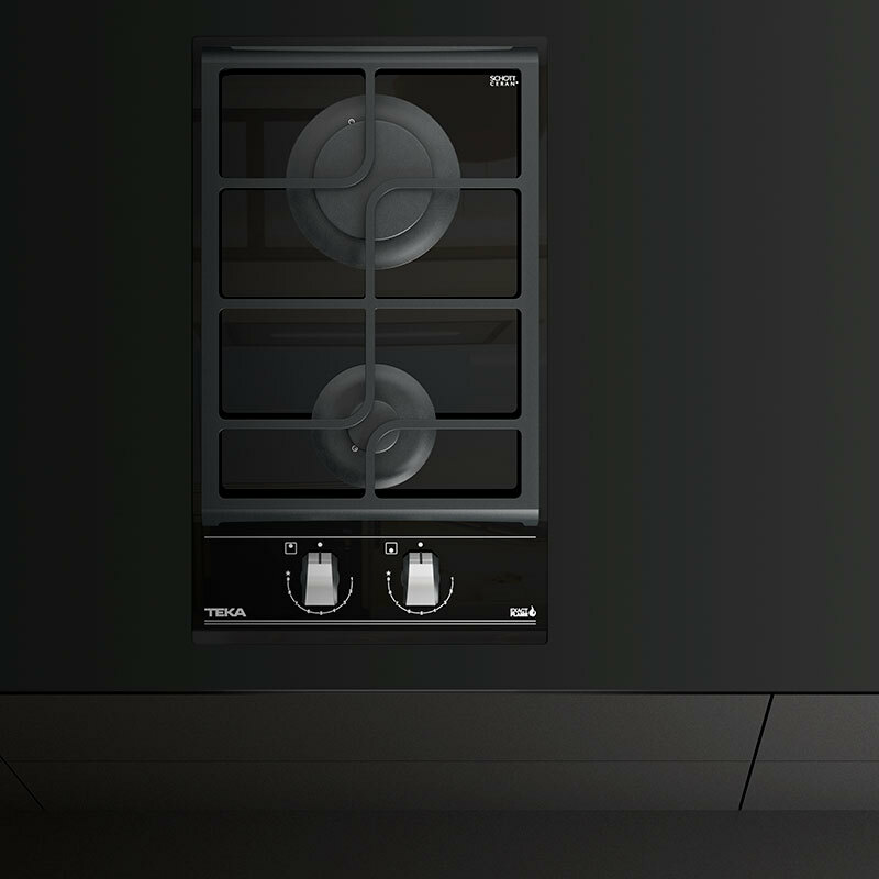 Placa de gas en cristal negro Teka GZC32300XBA de 30 cm con 2 quemadores SABAF de alta eficiencia, autoencendido y termopar de seguridad. Presenta 9 niveles de potencia ExactFlame, parrillas de fundición, instalación Fast-Click y adaptadores para butano y gas natural. Diseño compacto y fácil mantenimiento.