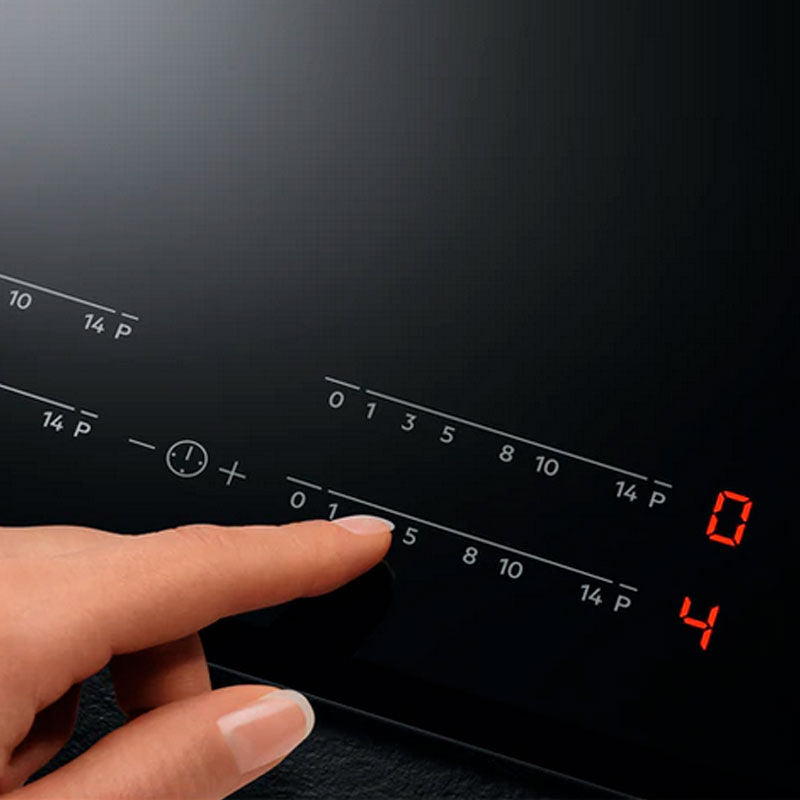 Placa de inducción AEG ILB63445FB de 60 cm con superficie vitrocerámica negra y diseño biselado de alta calidad. Ofrece 3 zonas, una zona anular ampliable de 28 cm y funciones avanzadas como PowerBoost, Hob2Hood, puente flexible, temporizador por zona y bloqueo infantil para una cocción rápida, segura y de fácil limpieza.