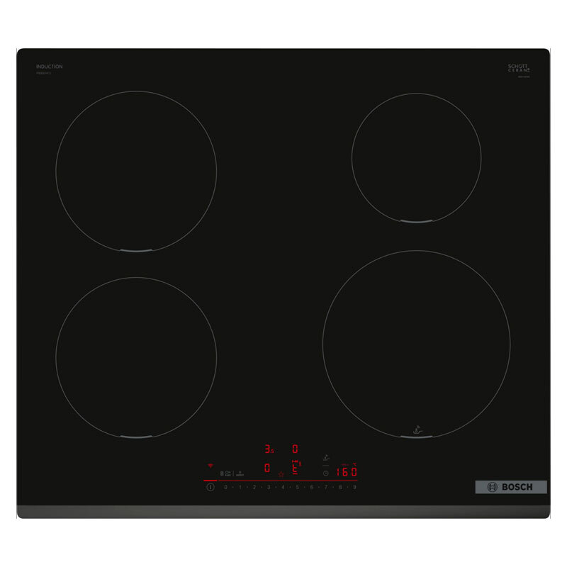 Placa de inducción Bosch PIE631HC1E 60 cm con superficie de cristal negro y cuatro zonas de cocción, potencia total 7400 W y función PowerBoost. Control táctil tipo Touch Slider con 17 niveles y temporizador por zona. Incluye bloqueo infantil, indicador de calor residual y conectividad Home Connect para control remoto. Diseño sin marco para instalación empotrada.