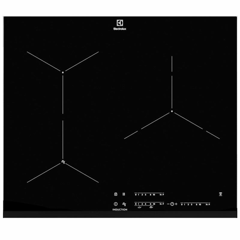Placa de inducción Electrolux EIF61342 de 60 cm diseñada para montaje integrable. Superficie vitrocerámica negra con tres zonas de cocción, incluida una zona doble de 28 cm y función PowerBoost. Incorpora control táctil deslizante, bloqueo infantil, temporizador por zona y compatibilidad Hob2Hood para mayor confort y seguridad.