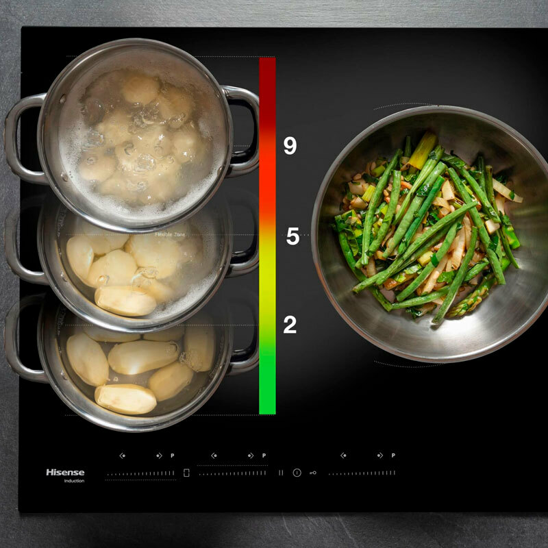 Placa de inducción Hisense HI6352BSCE de 59,0 cm con zona Flex y cuatro zonas, potencia total 7400 W y zona grande de 29,0 cm. Superficie cristal negro fácil de limpiar, control táctil deslizante, temporizador por zona y función Power Boost. Incluye bloqueo infantil, indicador de calor residual y gestión de potencia para instalación integrada.
