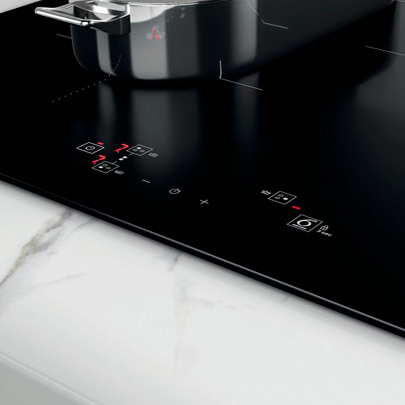 Placa de inducción Whirlpool WB Q4860 NE de 59,0 cm en cristal negro para instalación integrable. Cuenta con 3 zonas de cocción, incluida una zona gigante de 30,0 cm, funciones 6th SENSE y Connexion Zone, booster por zona, temporizador por zona y bloqueo infantil. Potencia total 7.200 W y Power Management para evitar sobrecargas.