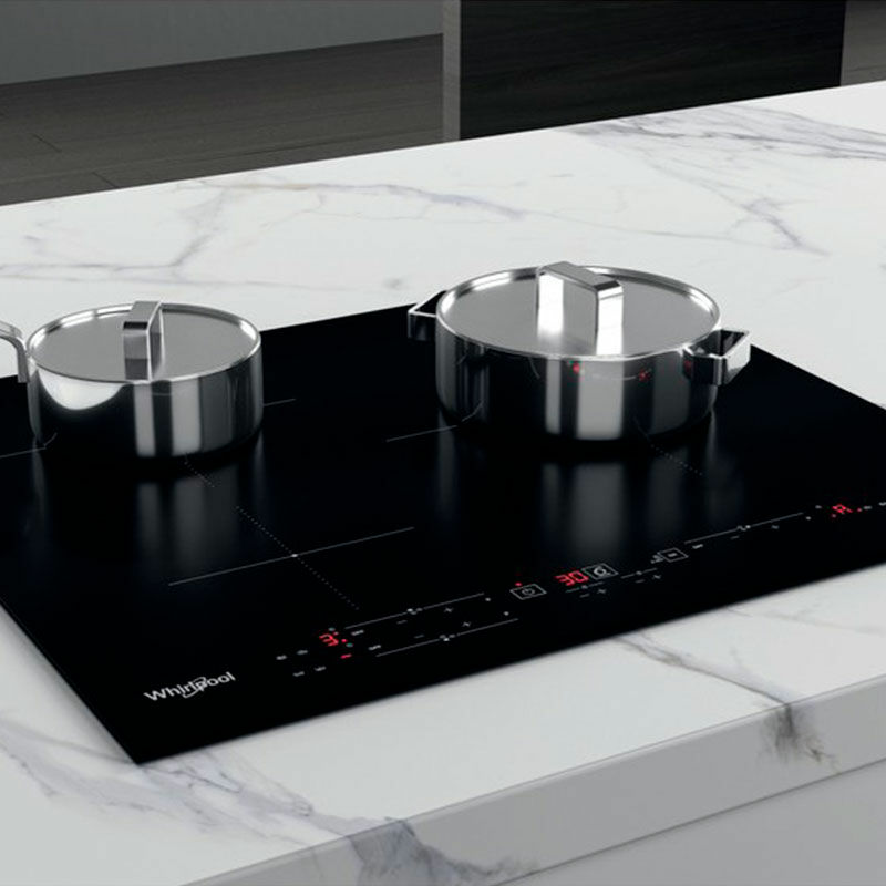 Placa de inducción Whirlpool WSB2360BF de 60 cm diseñada para una cocción rápida y eficiente. Dispone de 3 zonas de inducción, potencia total de 7200 W y función Booster por zona. Control táctil independiente, temporizadores por zona, bloqueo infantil e indicador de calor residual. Acabado esmaltado y marco biselado para integración empotrada; incorpora funciones 6th SENSE y Power Management para evitar sobrecargas.