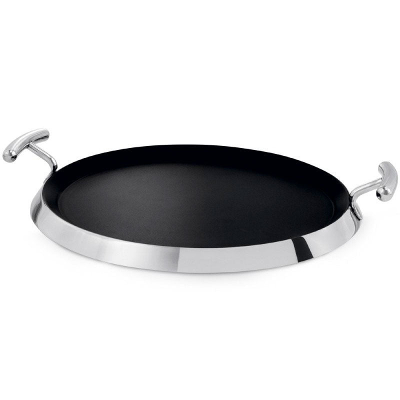 Grill redondo Teka de acero inoxidable de 34,0 cm con recubrimiento Greblon C3+ que ofrece un efecto antiadherente duradero y resistencia a rayaduras. Base triple de 6,3 mm que asegura transmisión térmica homogénea y evita deformaciones. Compatible con inducción, vitrocerámica y gas, incorpora asas de acero para manejo seguro y mayor durabilidad.