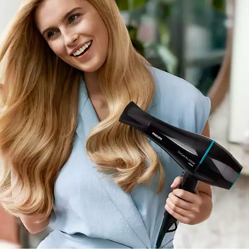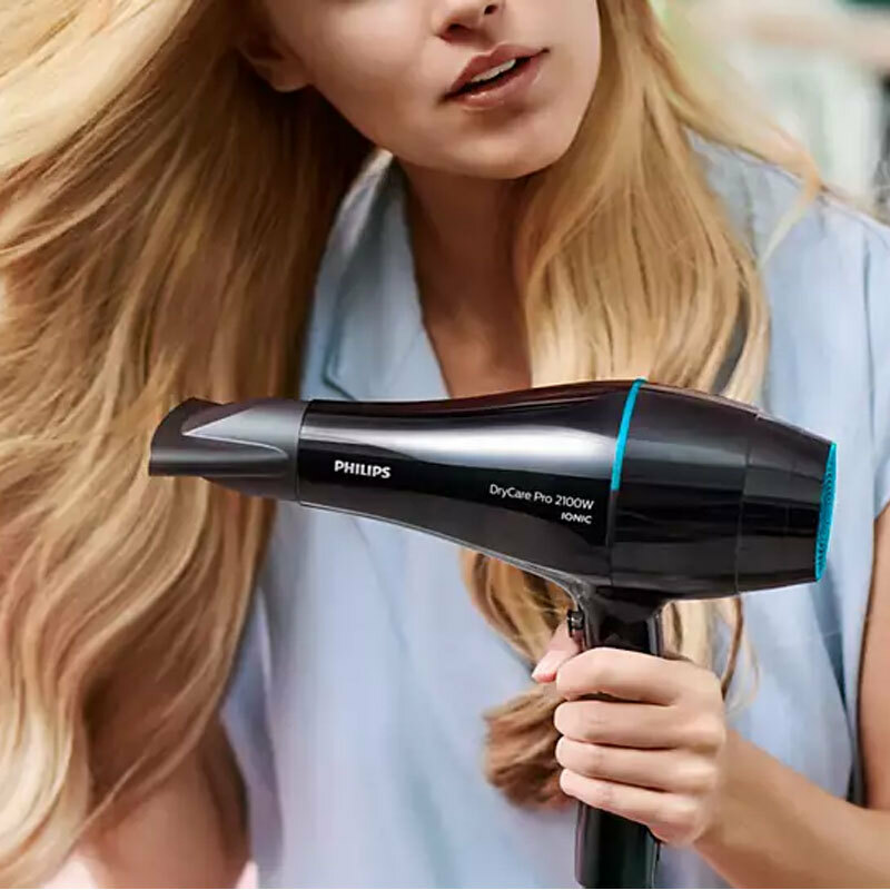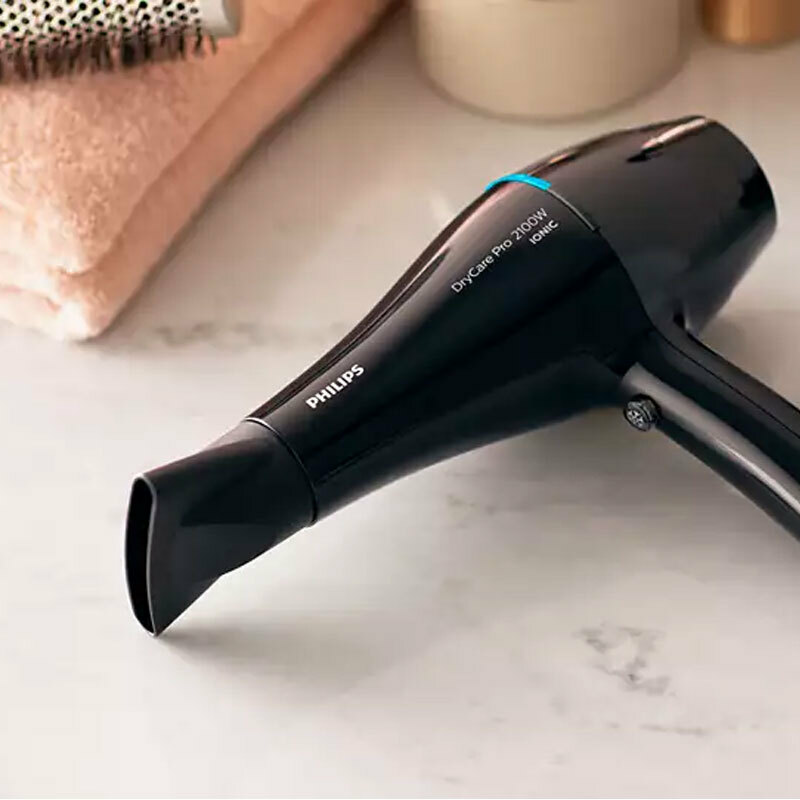 Secador Philips DryCare Pro BHD272/00 diseñado para un secado rápido y profesional con motor AC de alto rendimiento y 2100 W. Incorpora tecnología iónica para reducir el encrespamiento, ajuste ThermoProtect para proteger el cabello y botón de aire frío para fijar el peinado, con boquilla concentradora incluida.