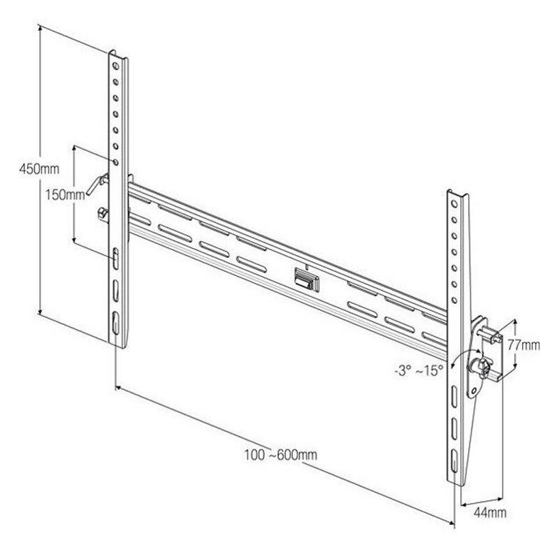 Soporte de pared inclinable Vivanco BTI8060 diseñado para televisores grandes de hasta 85 pulgadas. Estructura metálica resistente con capacidad de carga de 50 kg y compatibilidad VESA hasta 600 x 400. Perfil plano, inclinación ajustable sin herramientas, base extra ancha y protección antirrobo. Incluye kit de montaje.