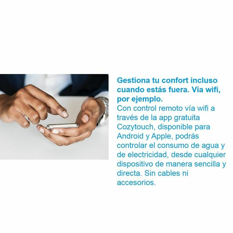 Termo eléctrico extraplano con conectividad WiFi y control electrónico diseñado para optimizar el consumo y la instalación en espacios reducidos. Dispone de display digital táctil, función ECO+ que aprende hábitos y doble cuba con resistencias cerámicas envainadas para mayor durabilidad y resistencia a la cal.