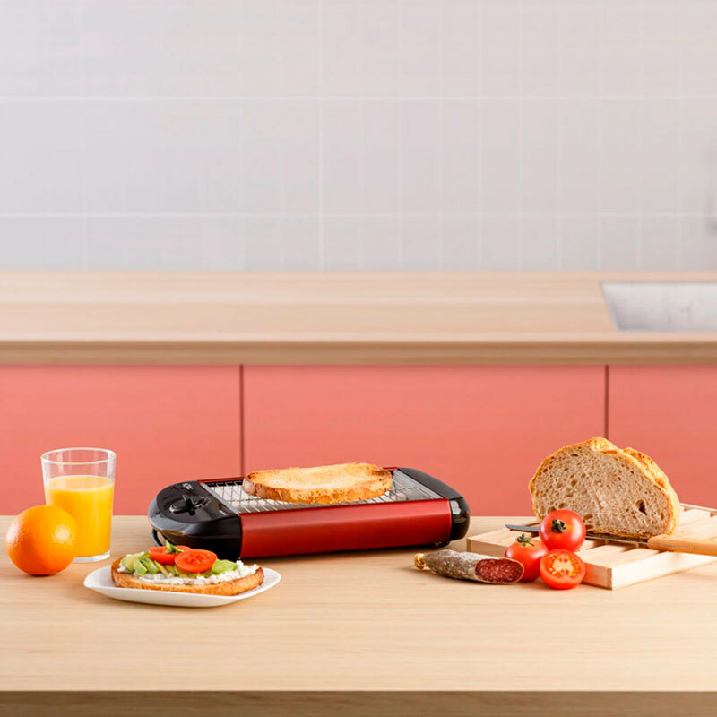 Tostadora plana Solac TC5309 diseñada para tostar con rapidez y uniformidad gracias a sus 700 W y dos resistencias de cuarzo. Dispone de amplia superficie de 24,5 x 18,5 cm, 12 niveles de tostado y funciones descongelar, recalentar y cancelar, facilitando su limpieza y almacenamiento.