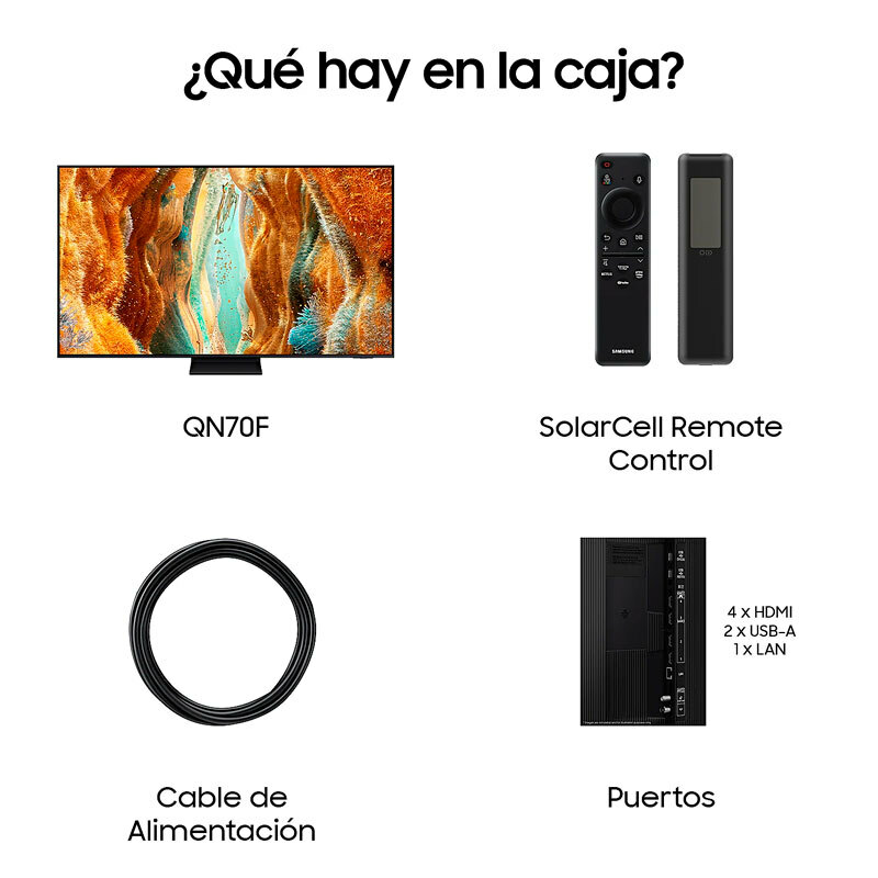 Televisor Samsung TQ55QN70FAUXXC Neo QLED de 55" con resolución 4K UHD y retroiluminación Mini LED que ofrece alto contraste y colores intensos. Incorpora procesador NQ4 AI Gen2 para escalado 4K, HDR10+ Adaptive, tasa 100 Hz (hasta 144 Hz), sistema Tizen, conectividad completa y 20 W de potencia de audio con Q‑Symphony y OTS Lite.