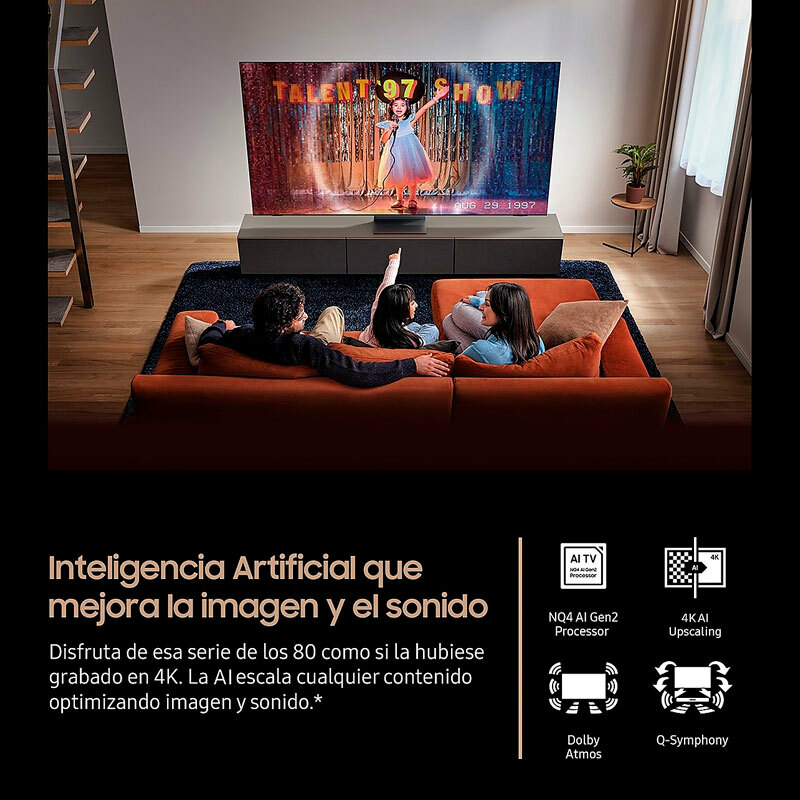 Televisor Neo QLED Samsung de 75 pulgadas con retroiluminación Mini LED y procesador NQ4 AI Gen2 que ofrece escalado 4K, amplio volumen de color y contraste preciso. Incorpora Motion Xcelerator 144Hz para gaming, sistema operativo Tizen con conectividad avanzada y sonido Q‑Symphony para experiencia inmersiva.