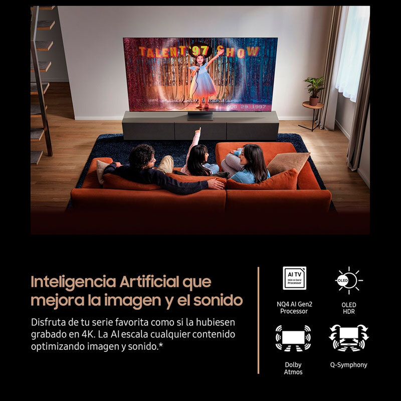 Televisor OLED Samsung TQ77S85FAEXXC de 77 pulgadas que ofrece imagen 4K UHD con procesador NQ4 AI Gen2 y escalado 4K por IA, alto contraste por píxeles autoiluminados y HDR10+ Adaptive. Incluye Smart TV con Tizen, funciones gaming 4K/120 Hz, sonido Dolby Atmos y diseño Contour en color negro grafito.