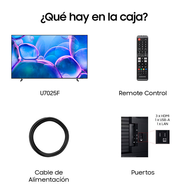Televisor Samsung TU50U7025FKXXC de 50 pulgadas con resolución UHD 4K y procesador Crystal 4K que mejora detalle y color. Incorpora HDR10+ compatible, sistema operativo Tizen Smart TV, diseño MetalStream y sonido 2.0 de 20 W con OTS Lite y Q‑Symphony. Conectividad versátil para HDMI, LAN, Wi‑Fi y Bluetooth.