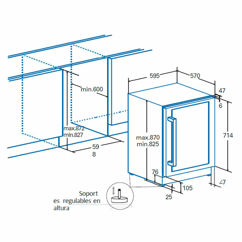 Vinoteca integrable CATA VI 59082 /A Inox para conservación de hasta 46 botellas con dos zonas de temperatura regulables entre 5 y 22 °C. Equipada con sistema No Frost y compresor, estantes de madera, iluminación LED, puerta reversible y control electrónico. Consumo 144 kWh/año y nivel sonoro 41 dB.