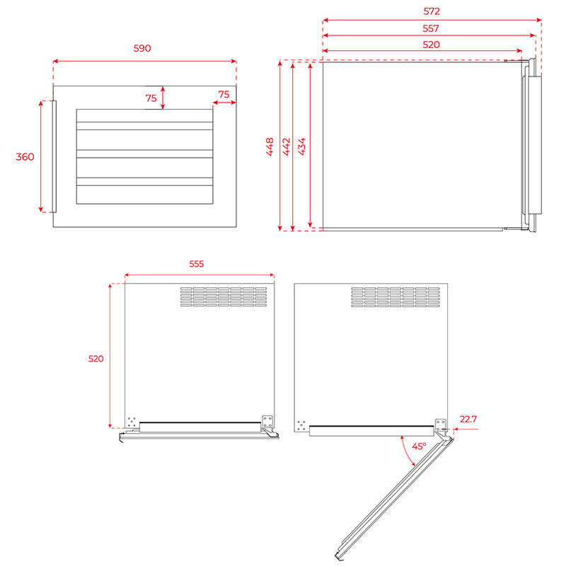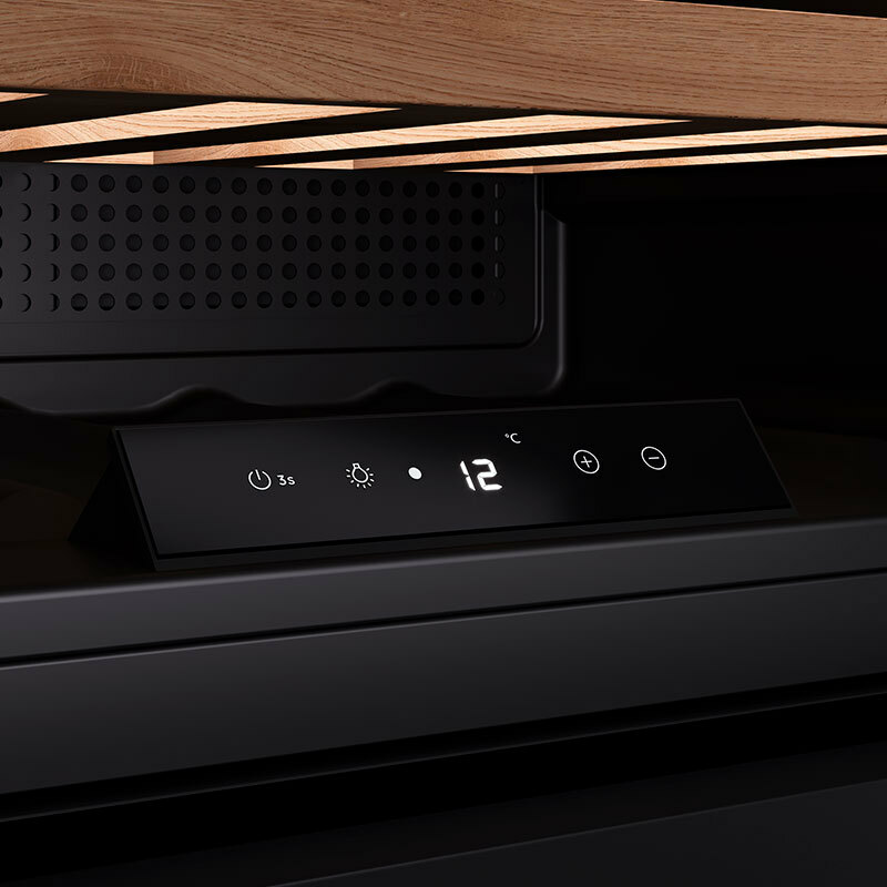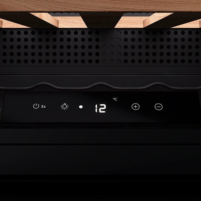 Vinoteca integrable de diseño negro para conservación profesional de hasta 24 botellas, con control electrónico y rango de temperatura 10-18 °C. Incorpora puerta de doble cristal con protección UV, estantes de madera extraíbles, luz interior LED, sistema antivibraciones y consumo anual de 100 kWh.