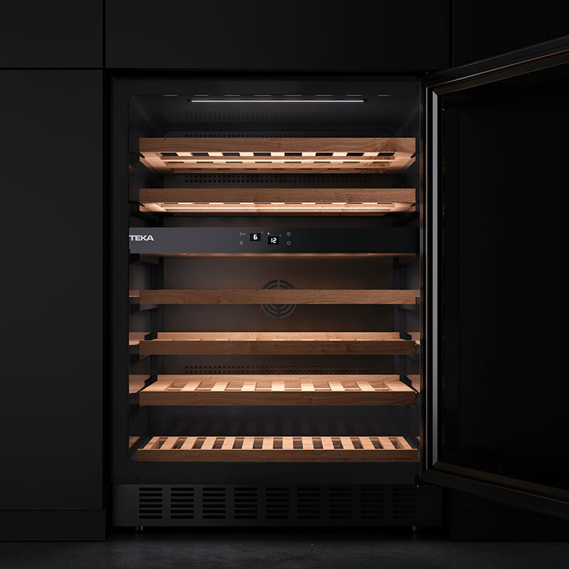 Vinoteca Teka RVU 20046 en acabado negro diseñada para conservar hasta 46 botellas mediante doble cristal tintado con protección UV y sistema de refrigeración ventilado con control electrónico. Incorpora estantes de madera, iluminación LED, puerta reversible y nivel sonoro reducido para una conservación óptima.